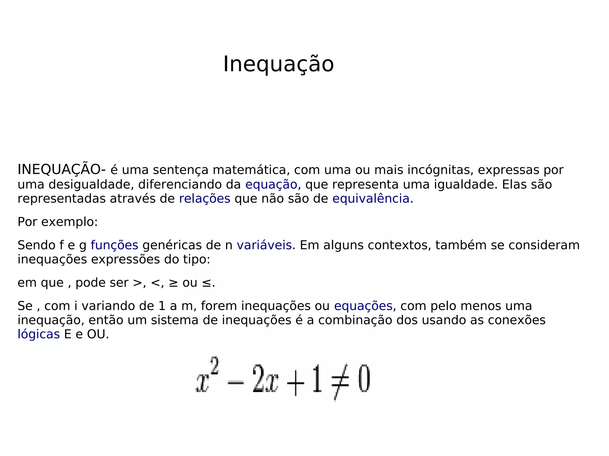 Uma inequação é uma sentença matemática expressa por uma desigualdade, diferente de uma equação que representa uma igualdade. Inequações são representadas por relações que não são de equivalência, como >, <, ≥ ou ≤. Um sistema de inequações é a combinação de várias inequações ou equações usando conexões lógicas E e OU.