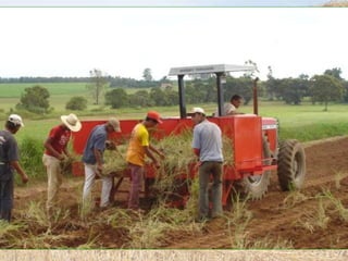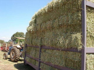 O documento discute o processo de fenação, abordando: 1) A escolha da forrageira ideal para fenação, destacando gramíneas como o capim-tifton e o capim-coastcross. 2) A importância de se estabelecer um "campo de feno" adequado. 3) As principais etapas do processo de fenação: corte, secagem, enfardamento e armazenamento. O documento ressalta a importância da secagem rápida e uniforme para manter a qualidade nutricional do