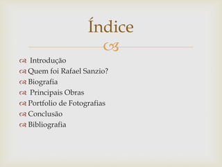Este documento fornece um resumo biográfico do pintor renascentista Rafael Sanzio, descrevendo sua vida e principais obras. O texto aborda sua formação com Pietro Perugino, seu trabalho para o Papa Júlio II e Leão X decorando os aposentos do Vaticano, e sua morte prematura aos 37 anos de idade. Imagens ilustram algumas de suas pinturas mais famosas.
