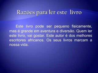 Este livro de Ondjaki é pequeno fisicamente mas grande em aventura e diversão. O autor é um dos melhores escritores africanos e seus livros marcam a vida dos leitores, oferecendo horas de boa leitura com aventuras emocionantes.