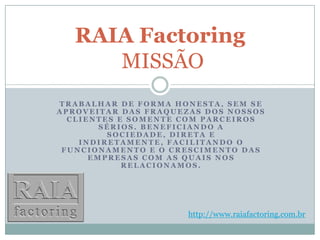 A empresa valoriza trabalhar de forma honesta com clientes e parceiros sérios para beneficiar a sociedade e facilitar o crescimento de empresas. Sua missão é ser respeitada no mercado por clientes, fornecedores e concorrentes, enquanto sua visão é investir em outras empresas para criar valor.