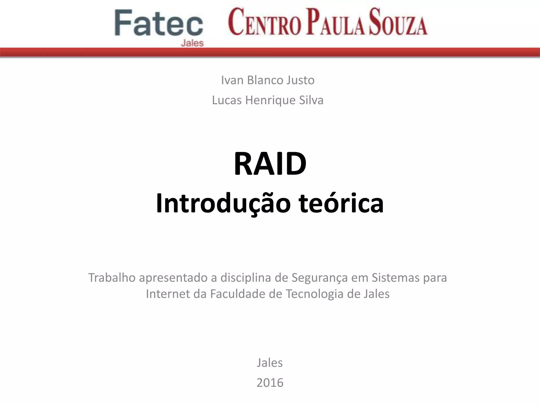 O documento discute os tipos de RAID (Redundant Array of Independent Disks), incluindo RAID 0, 1, 10, 2, 3, 4, 5 e 6. RAID é um mecanismo que melhora o desempenho e segurança dos discos rígidos através da redundância. Cada tipo de RAID oferece diferentes níveis de desempenho e proteção contra falhas de disco. O documento também menciona JBOD, que agrega discos para aumentar o armazenamento sem redundância.