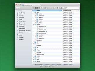 O documento apresenta Ruby on Rails como uma alternativa de desenvolvimento ágil de software que faz os desenvolvedores mais felizes. Lucas Catón, um desenvolvedor Ruby on Rails, discute como a linguagem Ruby e o framework Rails tornam o desenvolvimento mais expressivo e produtivo em comparação com Java. Rails já vem com muitos recursos prontos para uso e ajuda a aplicar boas práticas como MVC e REST.