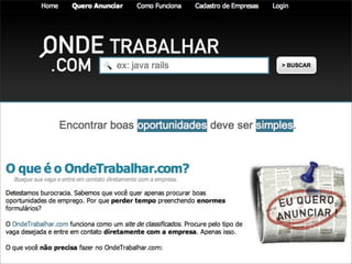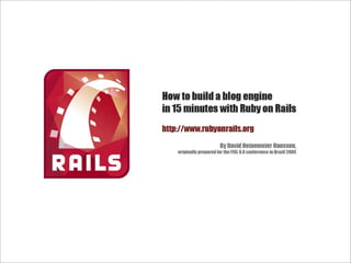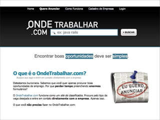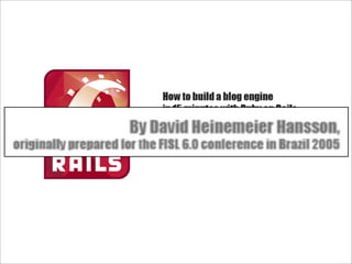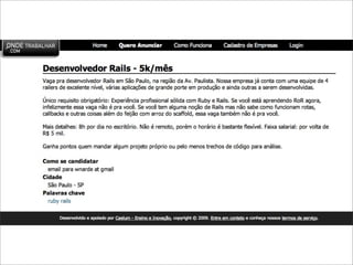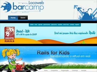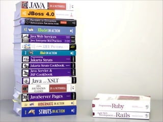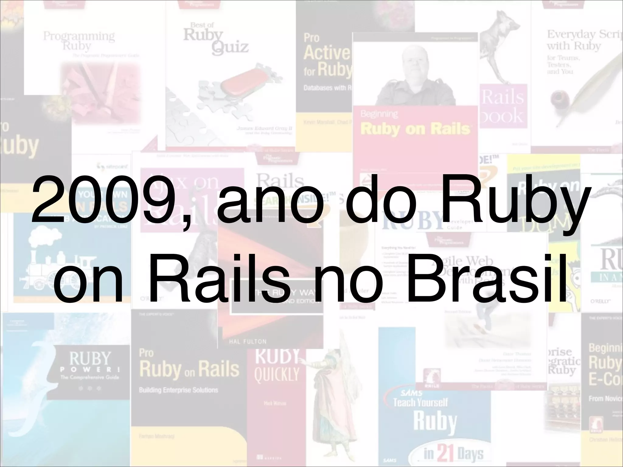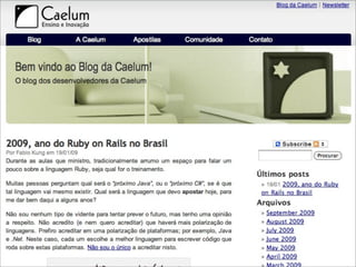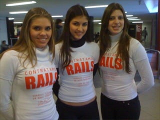 O documento discute o crescimento da popularidade do framework Ruby on Rails no Brasil em 2009. Apresenta as principais características da linguagem Ruby como orientada a objetos, tipagem dinâmica e meta-programação. Exemplifica o uso de Ruby on Rails para desenvolvimento web comparando com Java e Scala. Defende que Rails permite simplificar e tornar possíveis aplicações complexas.