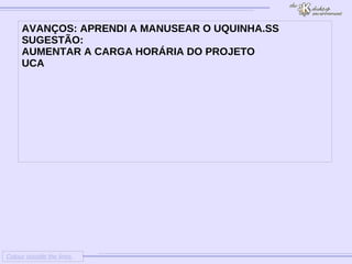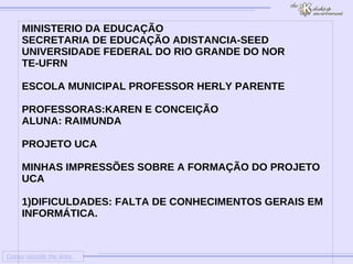 O documento discute as impressões de uma aluna sobre seu projeto UCA. Ela aponta a falta de conhecimentos gerais em informática como uma dificuldade inicial, mas que aprendeu a usar o Uquinhas. Ela sugere aumentar a carga horária do projeto para aperfeiçoar ainda mais o aprendizado.