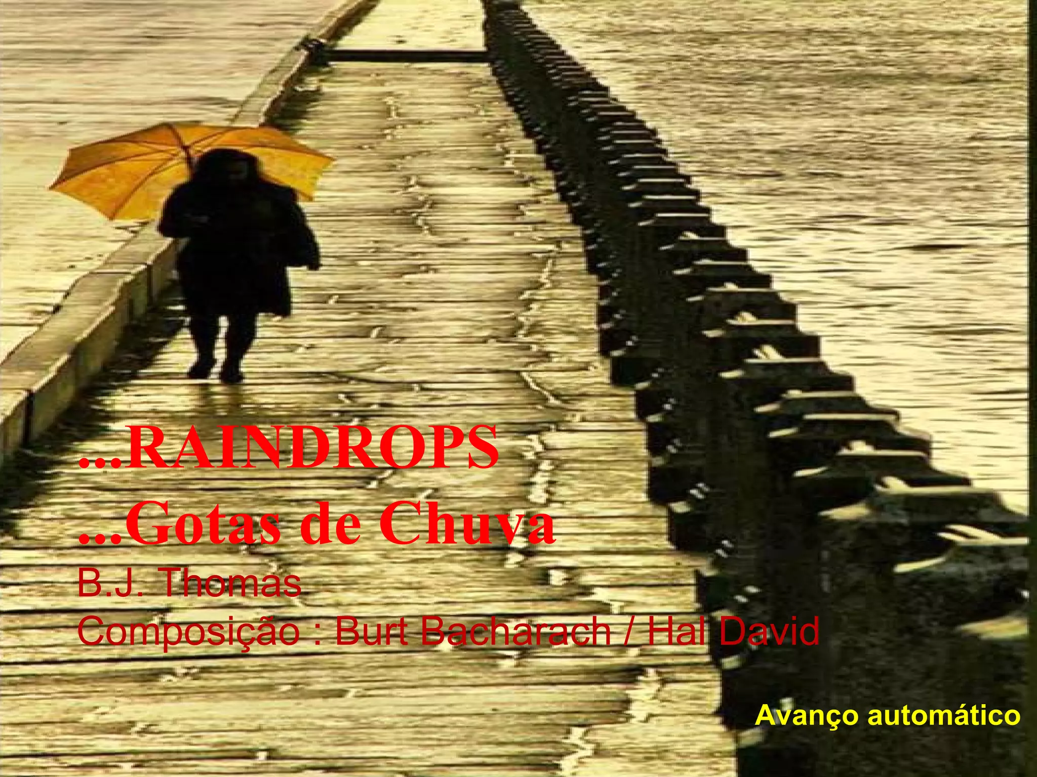 O documento é a letra da música "Raindrops Keep Fallin' on My Head" de B.J. Thomas. A música descreve como o cantor não se importa com as gotas de chuva que caem em sua cabeça porque ele é livre e nada o preocupa.