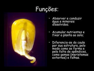 1) As raízes absorvem e conduzem água e minerais, acumulam nutrientes e fixam a planta no solo.
