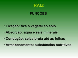 O documento descreve as funções e estruturas da raiz e do caule em plantas. A raiz fixa a planta no solo, absorve água e sais minerais, conduz a seiva bruta para as folhas e armazena substâncias nutritivas. O caule sustenta as folhas e frutos e conduz a seiva bruta e elaborada através do xilema e floema.