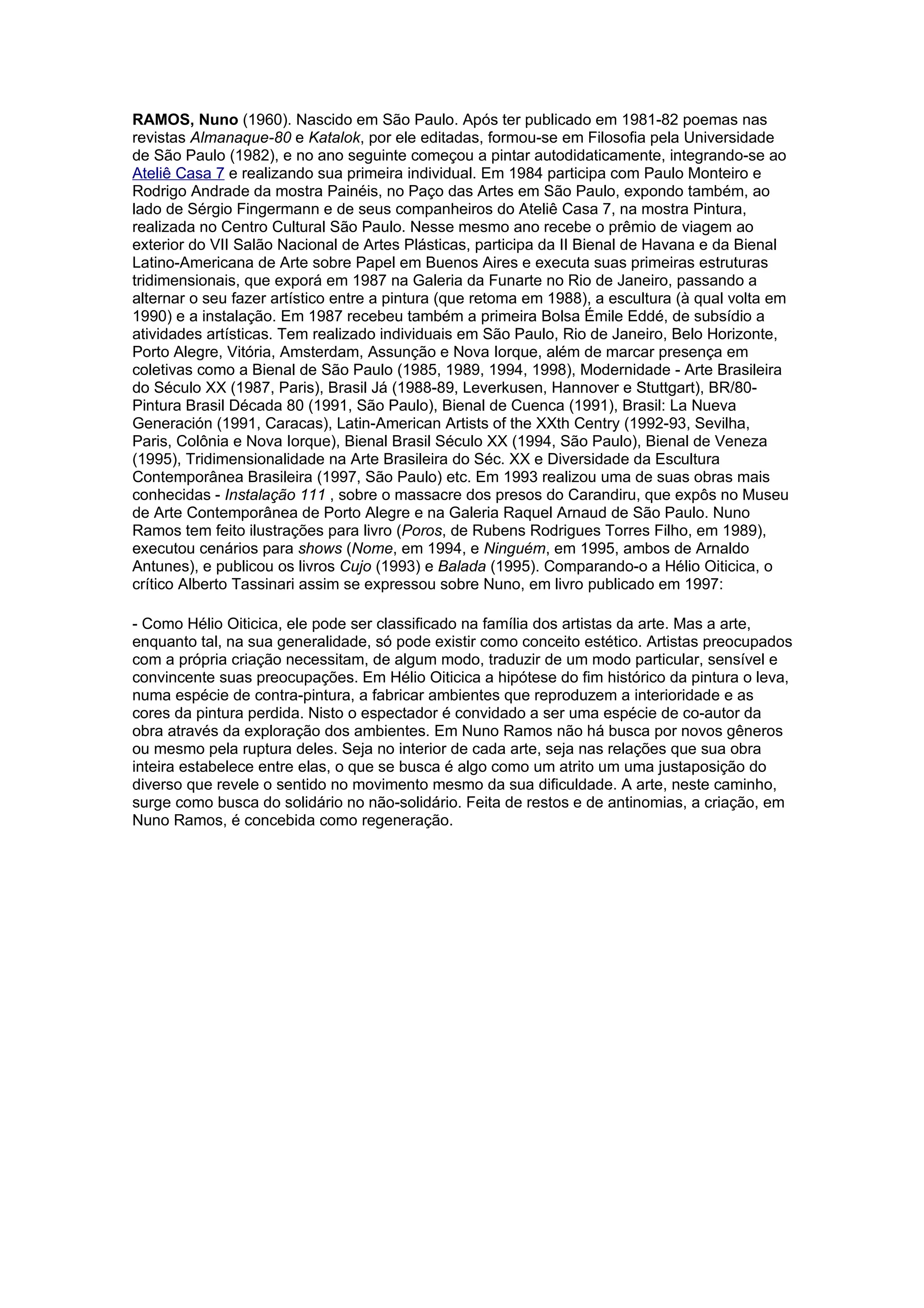 Nuno Ramos é um artista plástico brasileiro nascido em 1960 em São Paulo. Após publicar poemas em revistas literárias, formou-se em Filosofia e começou a pintar autodidaticamente. Ramos tem trabalhado com pintura, escultura e instalação, realizando exposições individuais e coletivas no Brasil e exterior. Seu trabalho explora a justaposição do diverso para revelar o sentido através do movimento e da dificuldade.
