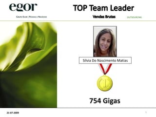 A equipe de vendas liderada por Sílvia Do Nascimento Matias gerou 754 Gigas em vendas brutas em 21 de julho de 2009, atingindo a meta de vendas do mês por meio de estratégias de outsourcing.