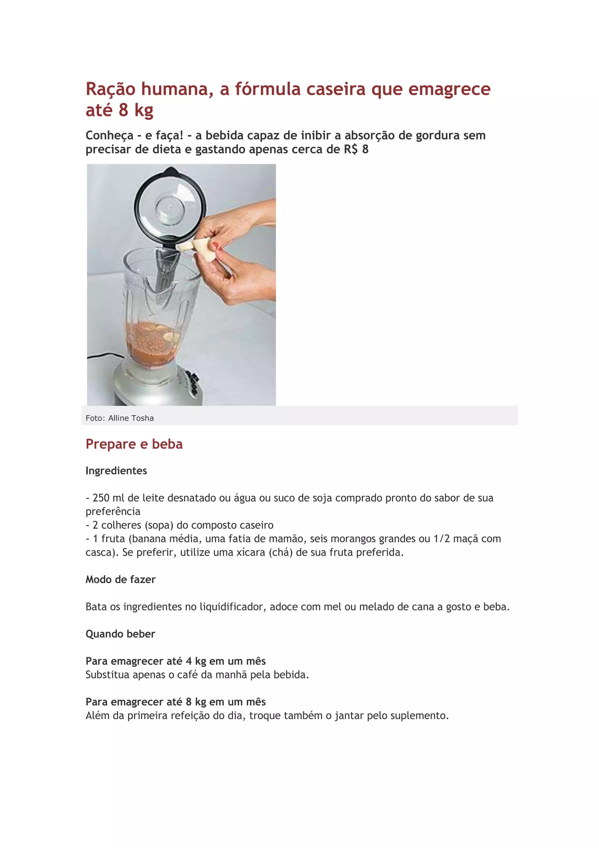 A ração humana é uma bebida caseira capaz de emagrecer até 8kg sem dieta restrita. Ela é feita com leite desnatado, composto caseiro e fruta no liquidificador. Bebida no café da manhã pode fazer emagrecer até 4kg por mês, substituindo também o jantar pode chegar a 8kg em um mês.