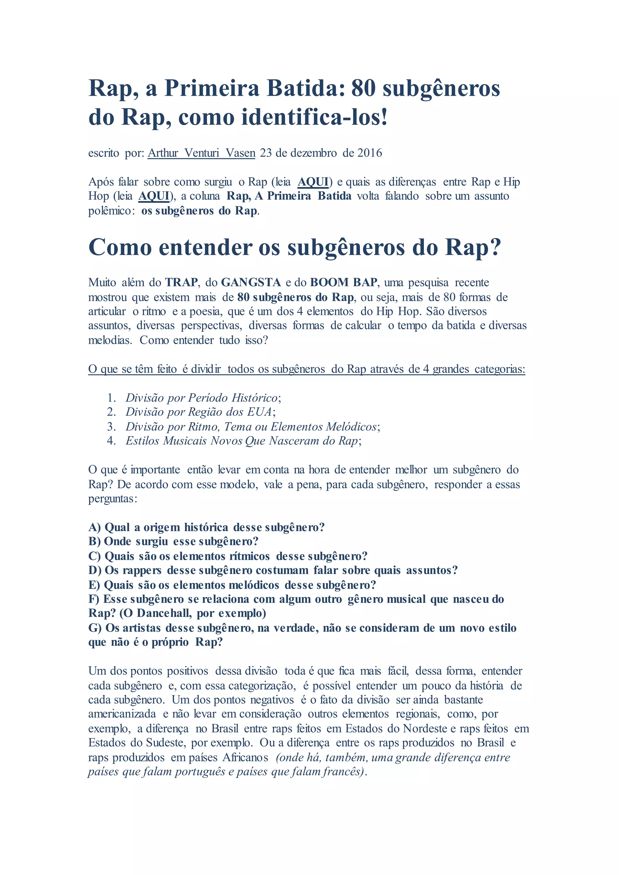 O documento lista e descreve mais de 80 subgêneros do rap, agrupados em 4 categorias: períodos históricos, regiões dos EUA, elementos rítmicos/temáticos e estilos musicais derivados do rap. Exemplos de subgêneros incluem boom bap, trap, gangsta rap e outros. O autor discute como entender cada subgênero através de sua origem, ritmo, temas e influências musicais.