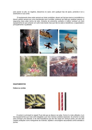 Este documento fornece informações básicas sobre técnicas de rappel e equipamentos de segurança, destacando a importância de treinamento profissional antes de praticar atividades verticais. Descreve os principais equipamentos como cordas, mosquetões e cadeirinhas, além de cuidados necessários e capacidades de carga.