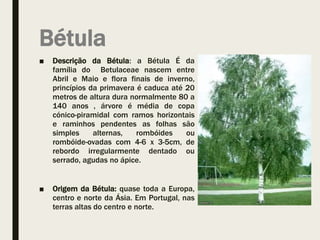 1) O documento descreve diversas flores, incluindo suas características e origem geográfica. 2) As flores descritas incluem bétula, camélia, carvalho, gladíolo, lírio, mimosa, narcisos, orquídea, rosa, tília, tojo e tulipa. 3) Cada flor tem sua descrição física e sua origem listada, geralmente na Europa, Ásia ou África.