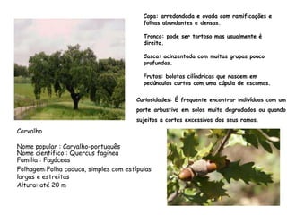 O documento apresenta informações sobre diferentes espécies de árvores e plantas, incluindo seus nomes populares e científicos, famílias, características e curiosidades. As espécies descritas incluem tília, carvalho, magnólia, plátano, pinheiro-manso, pinheiro-bravo, bétula, camélia, rosa, buxo, avenca, urze, gladíolo, papoila-dormideira, glicínia, trigo, dormideira e feto-de-cabelinho.