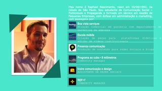 Raphael Nascimento é um estudante de Comunicação Social e formado em Gestão de Pequenas Empresas. Ele tem experiência em criação de conteúdo para redes sociais e blogs de várias empresas como Decolar.com, Tupperware Brasil e Mercado Livre. Seu currículo resume suas qualificações e experiência em community manager.