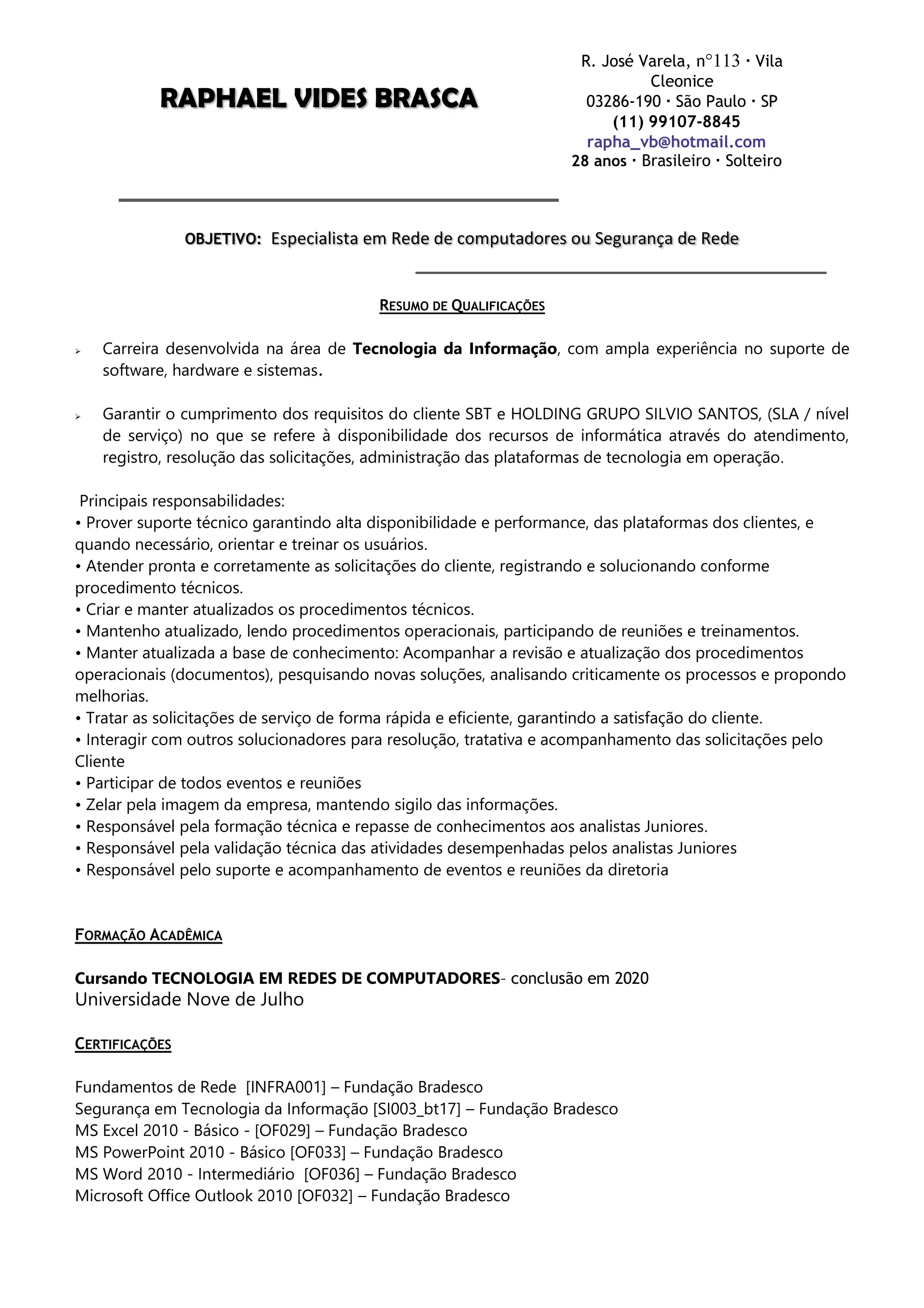 Raphael Vides Brasca está cursando Tecnologia em Redes de Computadores e busca uma posição como Especialista em Rede de Computadores ou Segurança de Rede. Ele tem mais de 7 anos de experiência como Analista de Suporte de TI para empresas como SBT e Holding Grupo Silvio Santos. Raphael possui diversas certificações em redes, segurança da informação e pacote Office.