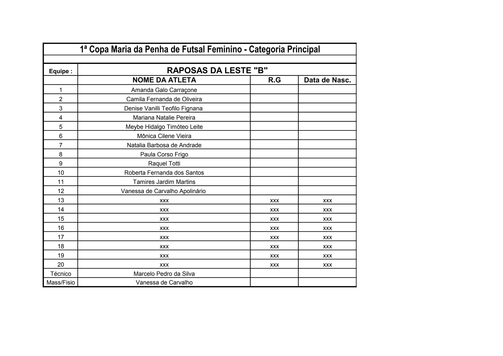 Este documento é a lista de atletas da equipe "Raposas da Leste B" que irá participar da 1a Copa Maria da Penha de Futsal Feminino na categoria principal. A lista contém os nomes das 20 atletas e dos técnicos Marcelo Pedro da Silva e Vanessa de Carvalho.