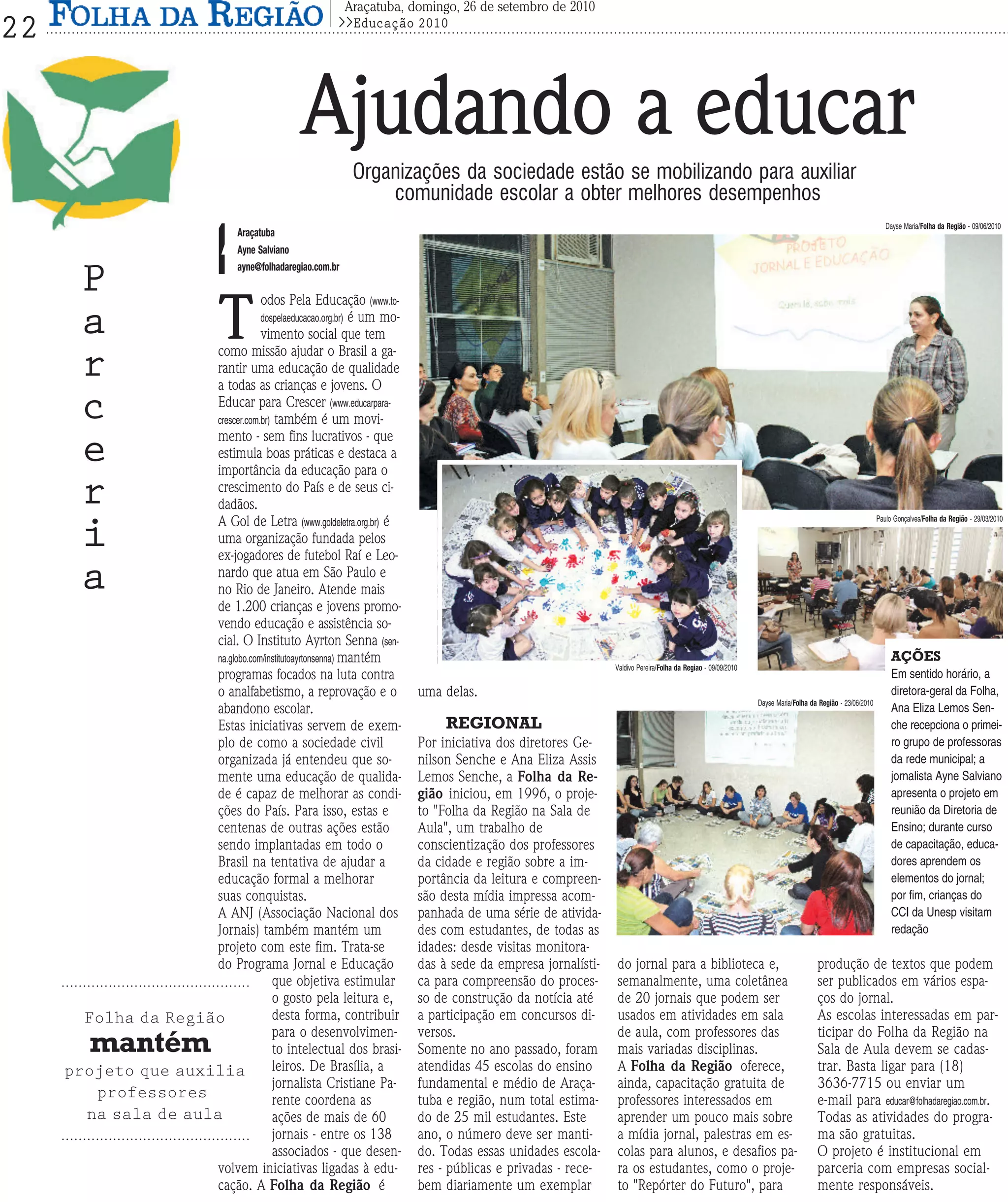 O documento descreve várias organizações que estão ajudando a melhorar a educação no Brasil, como o Todos Pela Educação, Educar para Crescer e Instituto Ayrton Senna. Também apresenta o projeto "Folha da Região na Sala de Aula" que fornece jornais e atividades para professores e alunos aprenderem sobre mídia impressa.