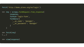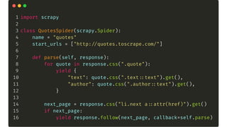 O documento apresenta uma introdução ao web scraping com Python usando o framework Scrapy. Explica que web scraping é a extração automatizada de dados de páginas da web para disponibilização estruturada. Também discute questões legais e técnicas como seletores, spiders e cookies.