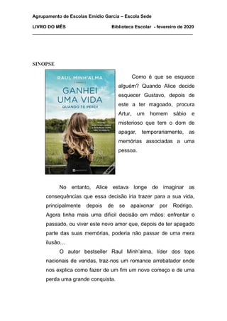 Este documento resume o livro "Como é que se esquece alguém?" do autor Raul Minh'alma. A história segue Alice, que procura um homem chamado Artur para apagar temporariamente as memórias do seu ex-namorado Gustavo depois de ele a magoar. No entanto, Alice acaba por se apaixonar por outro homem, Rodrigo, o que a coloca numa difícil decisão entre enfrentar o passado ou viver este novo amor.