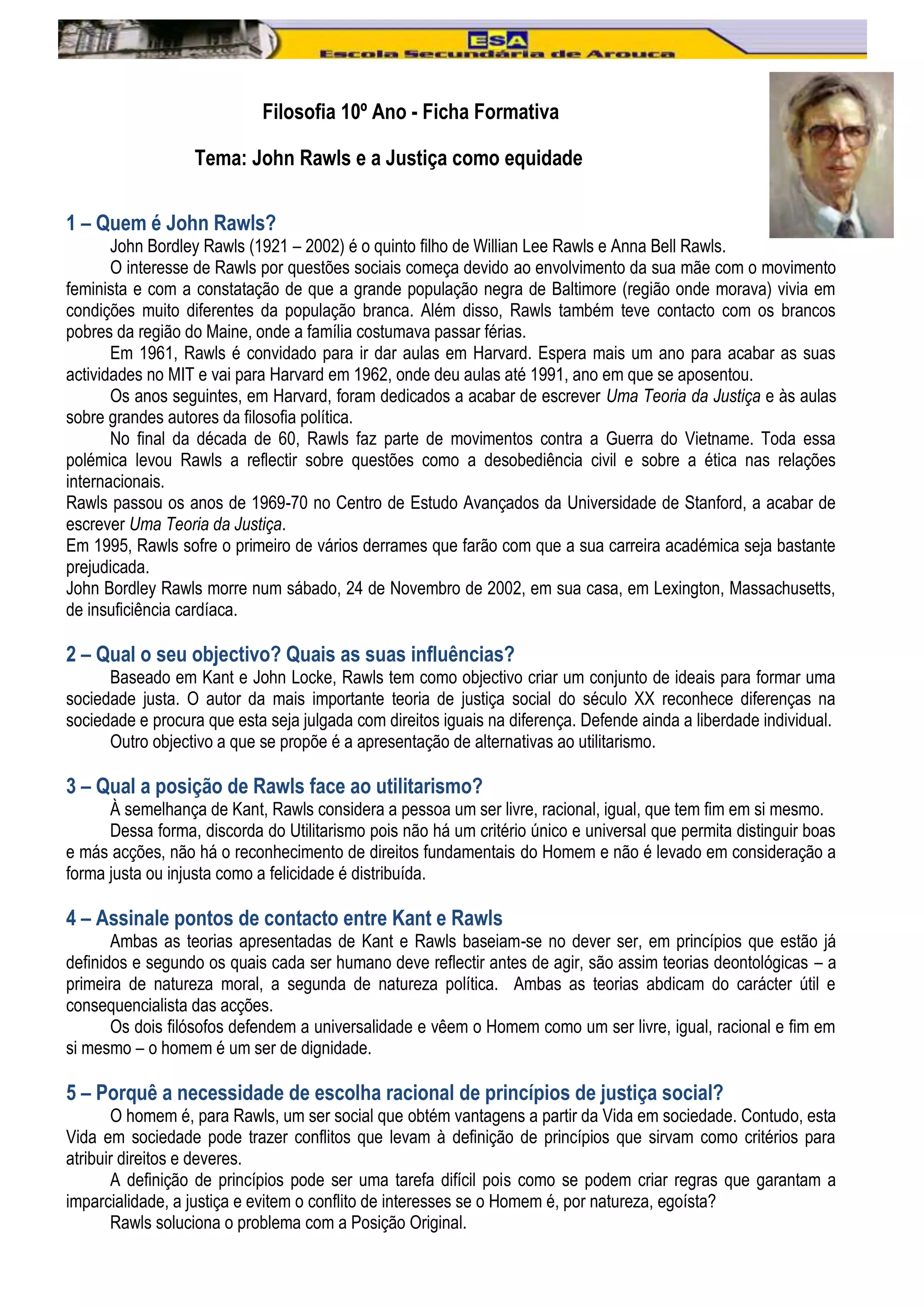 O documento descreve a vida e obra do filósofo John Rawls. Rawls desenvolveu a teoria da justiça como equidade, influenciado por Kant e John Locke. Ele propõe dois princípios de justiça social: o princípio da igualdade e o princípio da diferença. Rawls defende a desobediência civil como último recurso para garantir os direitos dos cidadãos.