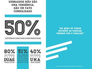 Este documento descreve a Rádio AGT Web Station (RAWS), uma rádio online brasileira criada em 2014 para divulgar bandas locais. A rádio transmite música, esportes, notícias e programas de entretenimento e atrai ouvintes de vários estados brasileiros e do exterior. Empresas podem se tornar patrocinadoras da rádio por meio de inserções, logotipos, entrevistas e podcasts para divulgar seus negócios. Interessados podem solicitar visitas ou contatar a rádio para participar como parceiros.