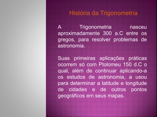 Este documento descreve a história da trigonometria desde sua origem na Grécia Antiga até o século XVII, quando começou a ser aplicada em astronomia, cartografia e navegação. Também apresenta exemplos práticos do uso de relações trigonométricas para resolver problemas como calcular a altura de um pilar e verificar se um avião pode colidir com uma torre.