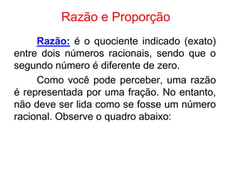 O documento explica os conceitos de razão e proporção matemática. Apresenta que uma razão é representada por uma fração que indica a relação entre dois números, sendo o antecedente e o conseqüente. Também define proporção como a igualdade entre duas ou mais razões e apresenta propriedades fundamentais como o produto dos extremos ser igual ao produto dos meios.