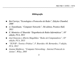 Este documento apresenta o programa da unidade curricular de Redes e Comunicações I do Instituto Superior de Tecnologias Avançadas. Inclui a bibliografia recomendada, avaliação e programa dividido em tópicos como Internet, protocolos e camadas de rede.