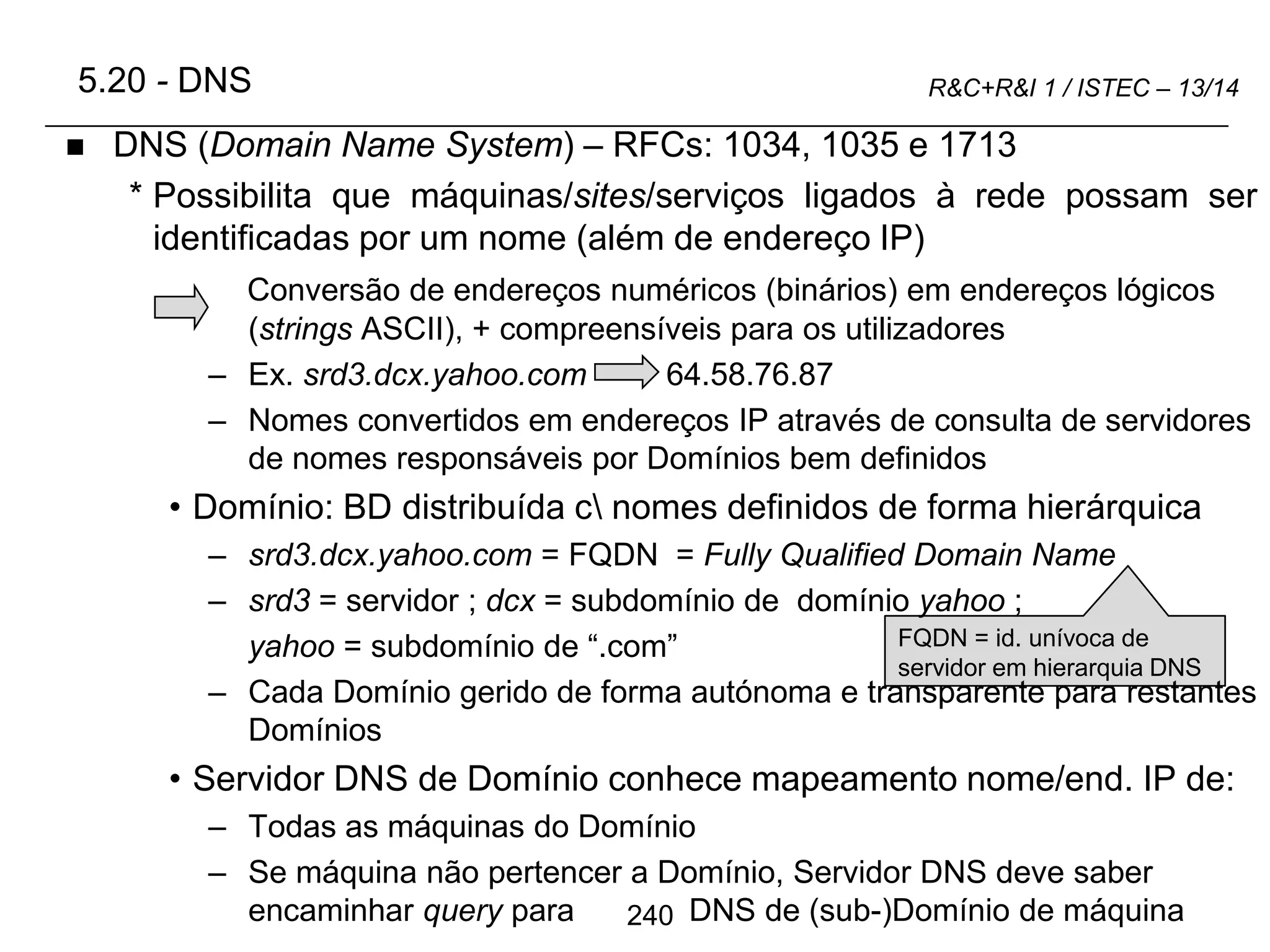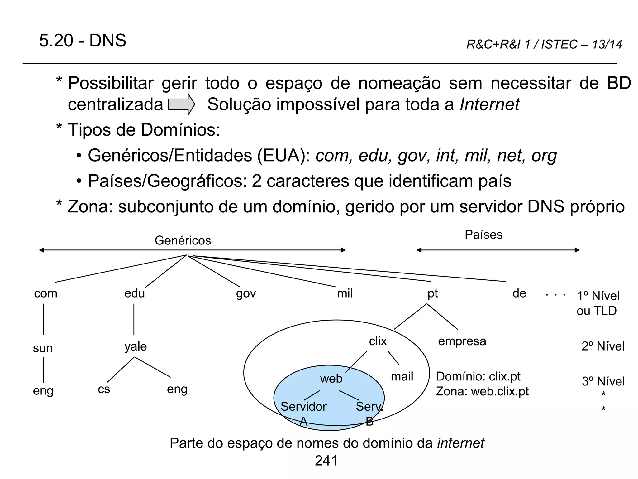 O documento descreve o sistema DNS (Domain Name System), que permite a conversão de endereços IP numéricos em nomes de domínio mais fáceis de memorizar para os utilizadores. O DNS organiza os nomes de domínio de forma hierárquica e utiliza servidores para realizar a tradução entre nomes e endereços IP.