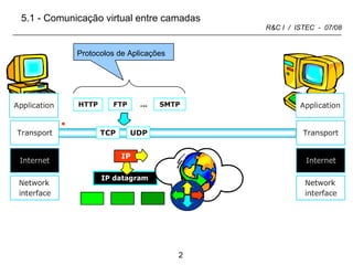 Tempo de vida - Contador de tempo de vida de pacote Decrementado em cada transmissão entre routers Previne possibilidade de pacotes se “perderem” na rede Erros nas tabelas de routing Endereço corrompido Quando atinge o valor 0 o fragmento é destruído e enviada uma mensagem a notificar a sua origem. Valor máximo = 255 Protocolo - Especifica o protocolo de camada superior: TCP, UDP Checksum - Calculado cada vez que um campo muda Ex. “tempo de vida” Opções - Possibilitar actualização no protocolo (futuras versões) Ex. poder especificar caminhos pretendidos, pedir aos routers que marquem o seu endereço e data/hora de passagem, etc 5.3 - Datagramas IP e os protocolos de transporte