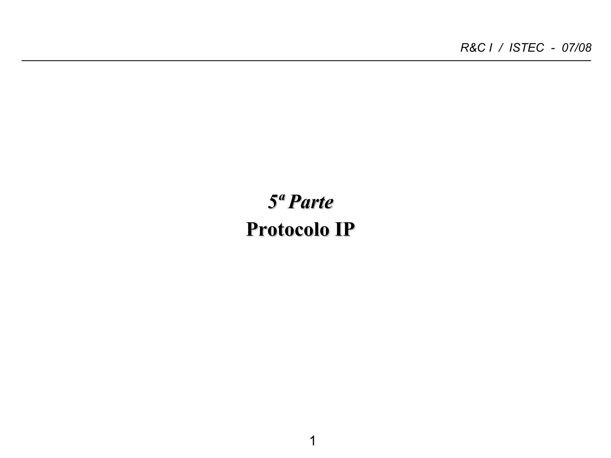 Protocolo IP (Internet Protocol ): Connectionless Oriented Não estabelece ligação Não fiável Não detecta nem recupera erros Comutação de pacotes (datagramas) Encaminhamento com base no endereço Comunicação entre quaisquer computadores/redes Endereçamento Universal Adaptação de tamanho de pacotes a dimensão de tramas Nível2 Poder executar fragmentação/junção de pacotes Não garante QoS (IP v4) Best Effort 5.2 - Protocolo IP e a criação de uma internet