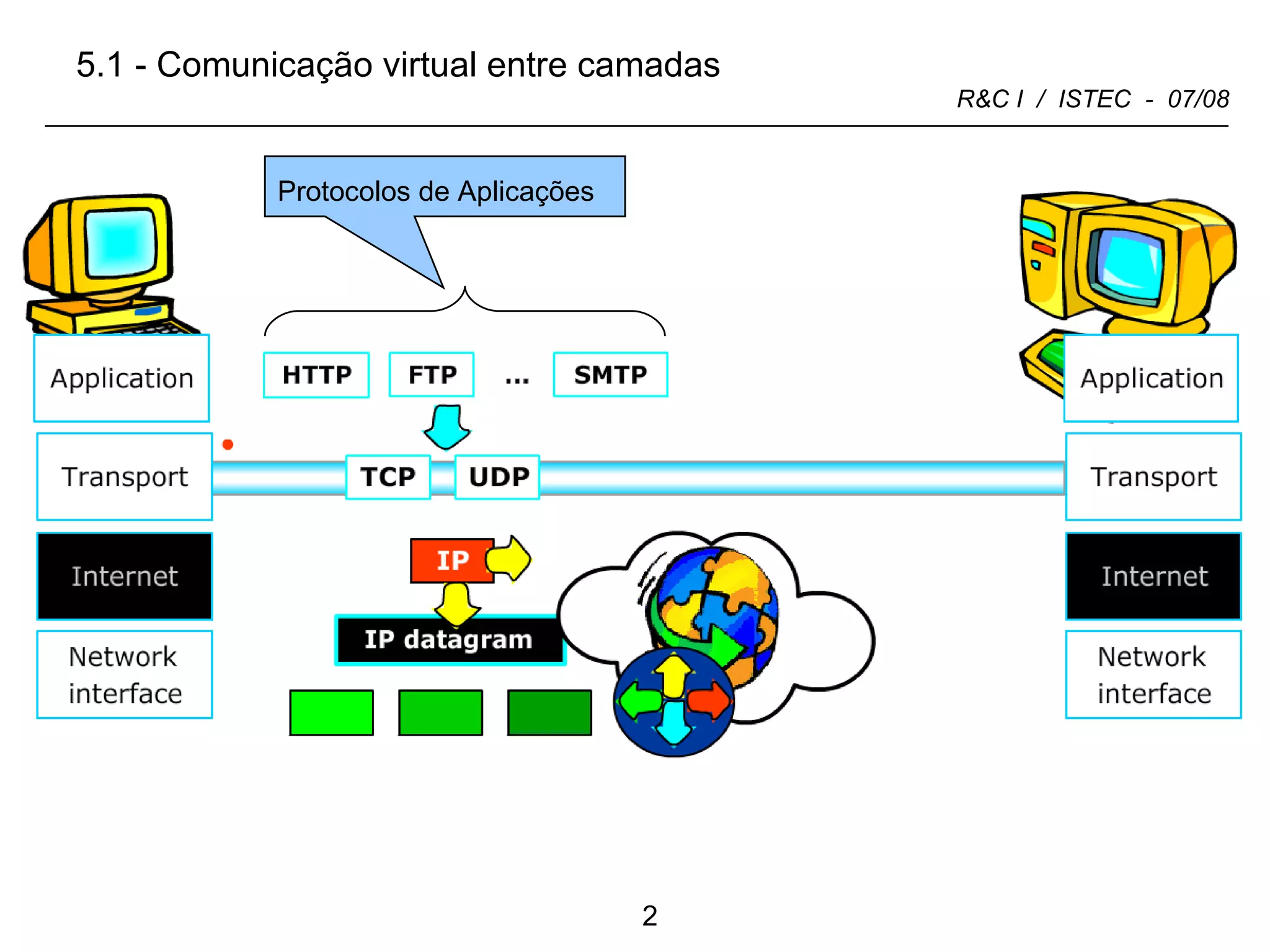 5.1 - Comunicaçãovirtual entre camadas Novas Aplicações: VoIP ( Voice Over IP) Desempenho imprevísivel na internet Desempenho razoável em redes de operadores Melhor controlo da ocupação da rede Serviço mais económico e flexível (PS) do que voz tradicional (CS)