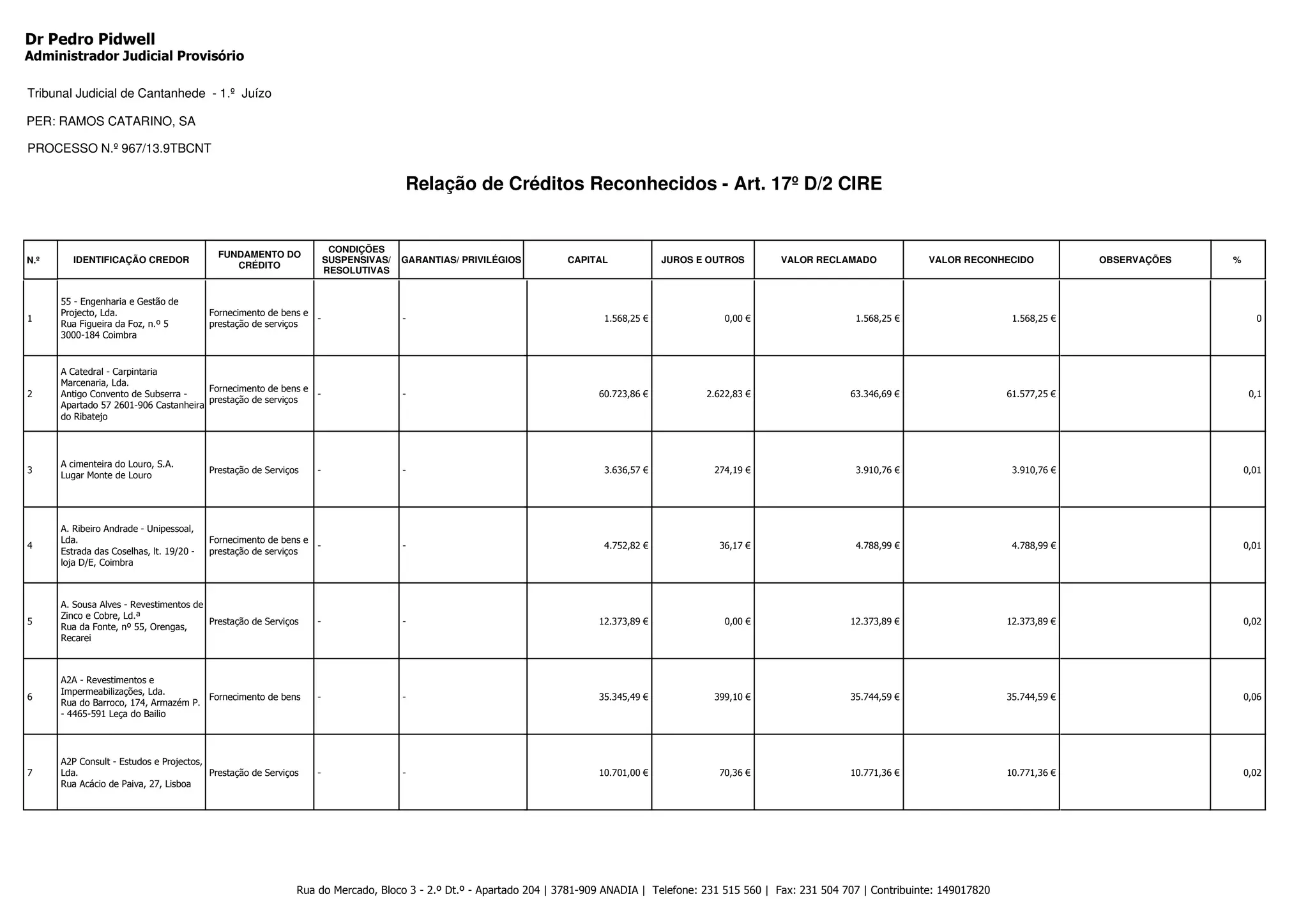 Este documento lista 42 créditos reconhecidos de fornecedores e ex-funcionários da empresa RAMOS CATARINO, SA. É fornecida a identificação do credor, o fundamento e valor do crédito, e se possui garantias ou privilégios. Os valores totais reconhecidos somam R$ 597.358,01.