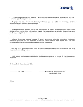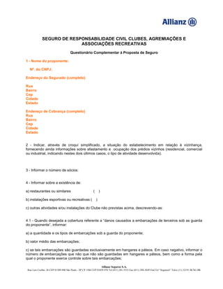 Questionário complementar para proposta de seguro de responsabilidade civil para clubes, agremiações e associações recreativas. O questionário solicita informações como endereço, número de sócios, atividades realizadas, embarcações sob guarda, programações fora das dependências, reclamações anteriores, coberturas de seguros anteriores e planos de expansão.