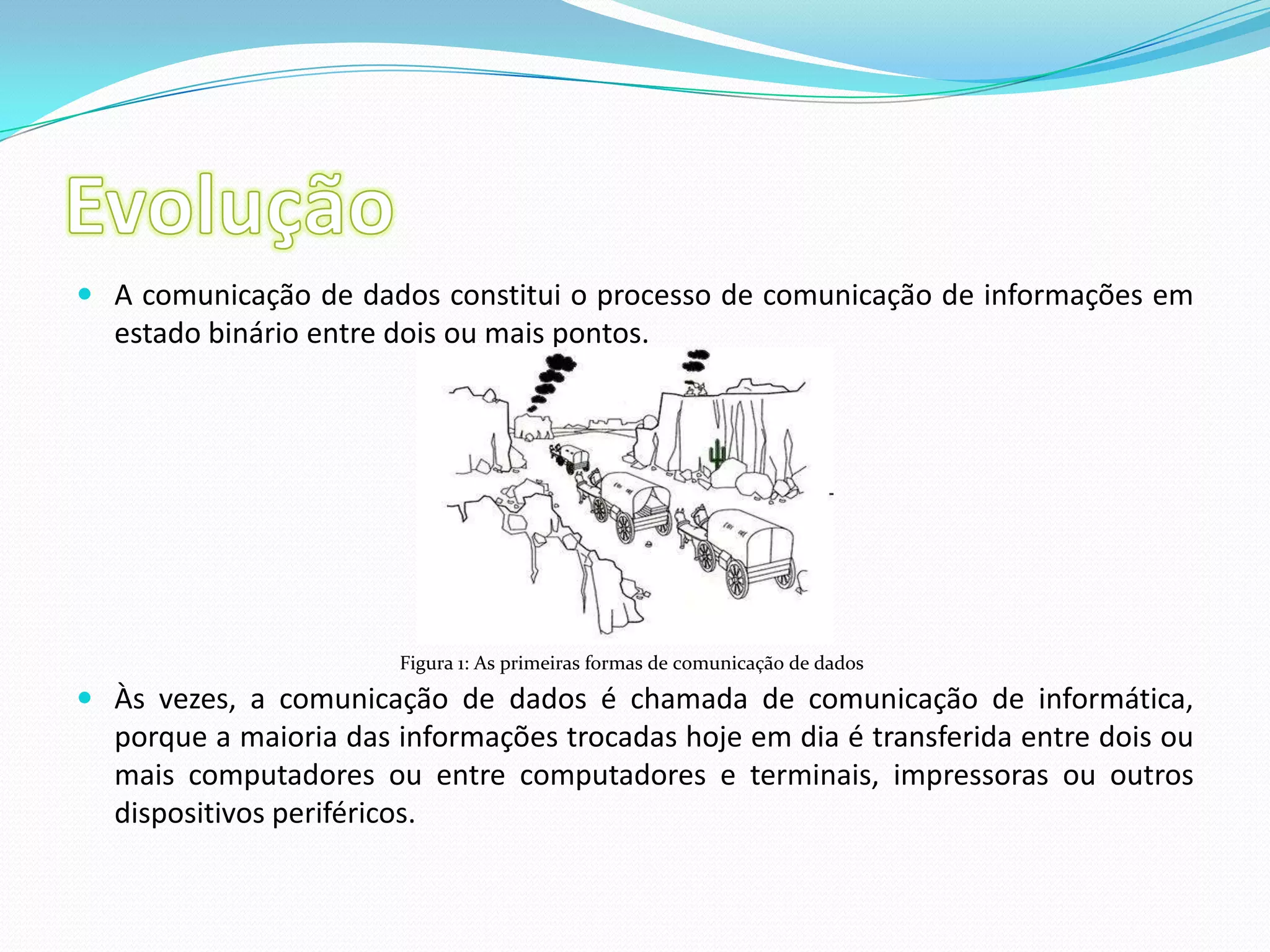 Este documento descreve a evolução da comunicação de dados desde o código Morse até os protocolos modernos. Detalha os principais componentes de um sistema de comunicação, incluindo emissor, receptor e canal, bem como os protocolos necessários para assegurar a transmissão correta de dados entre dois pontos.