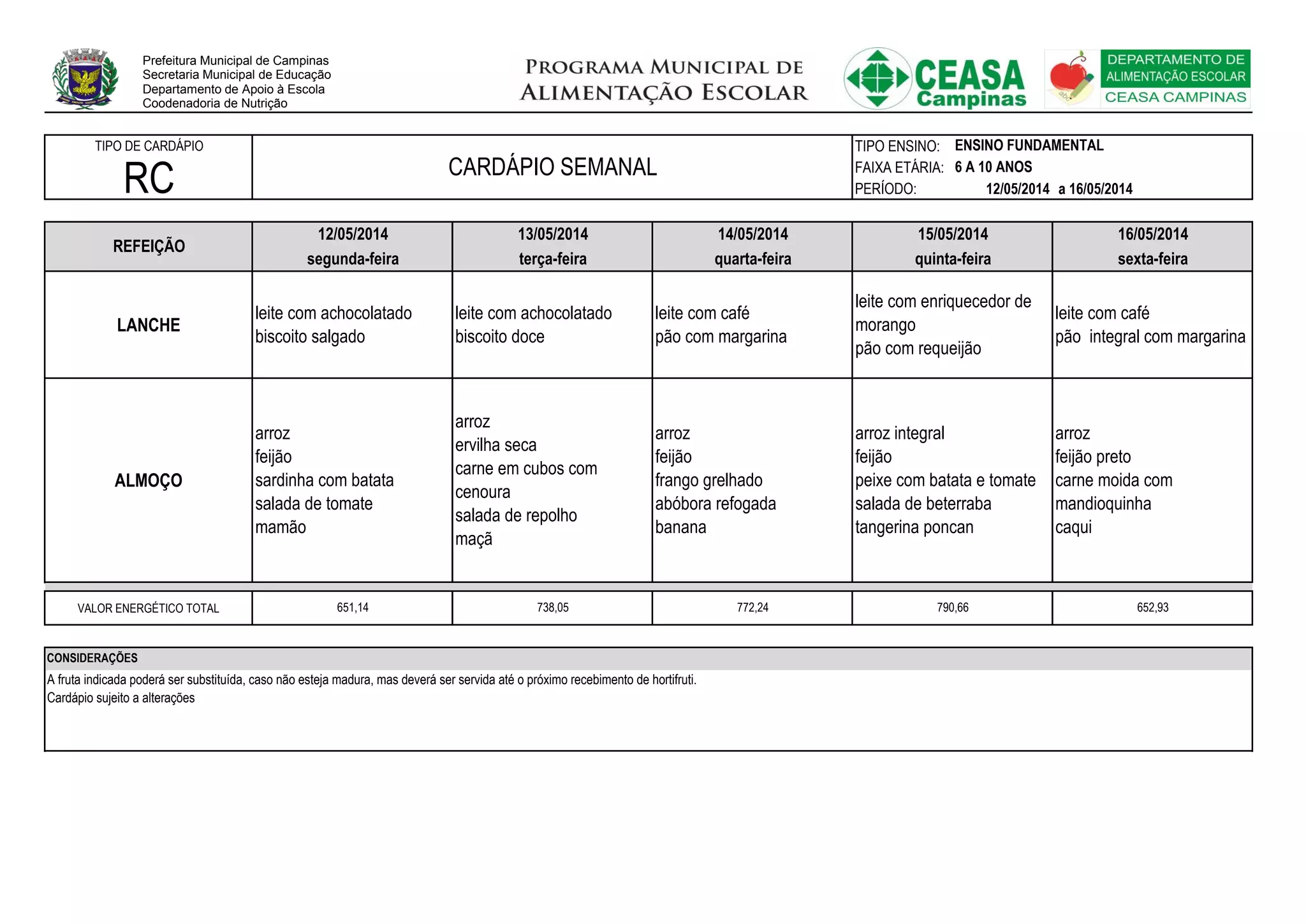 O cardápio semanal para alunos de 6 a 10 anos de uma escola municipal de Campinas para o período de 12 a 16 de maio inclui arroz, feijão, carnes e legumes como pratos principais e frutas como sobremesa. O cardápio está sujeito a alterações caso os itens não estejam disponíveis e fornece as calorias diárias para as refeições.