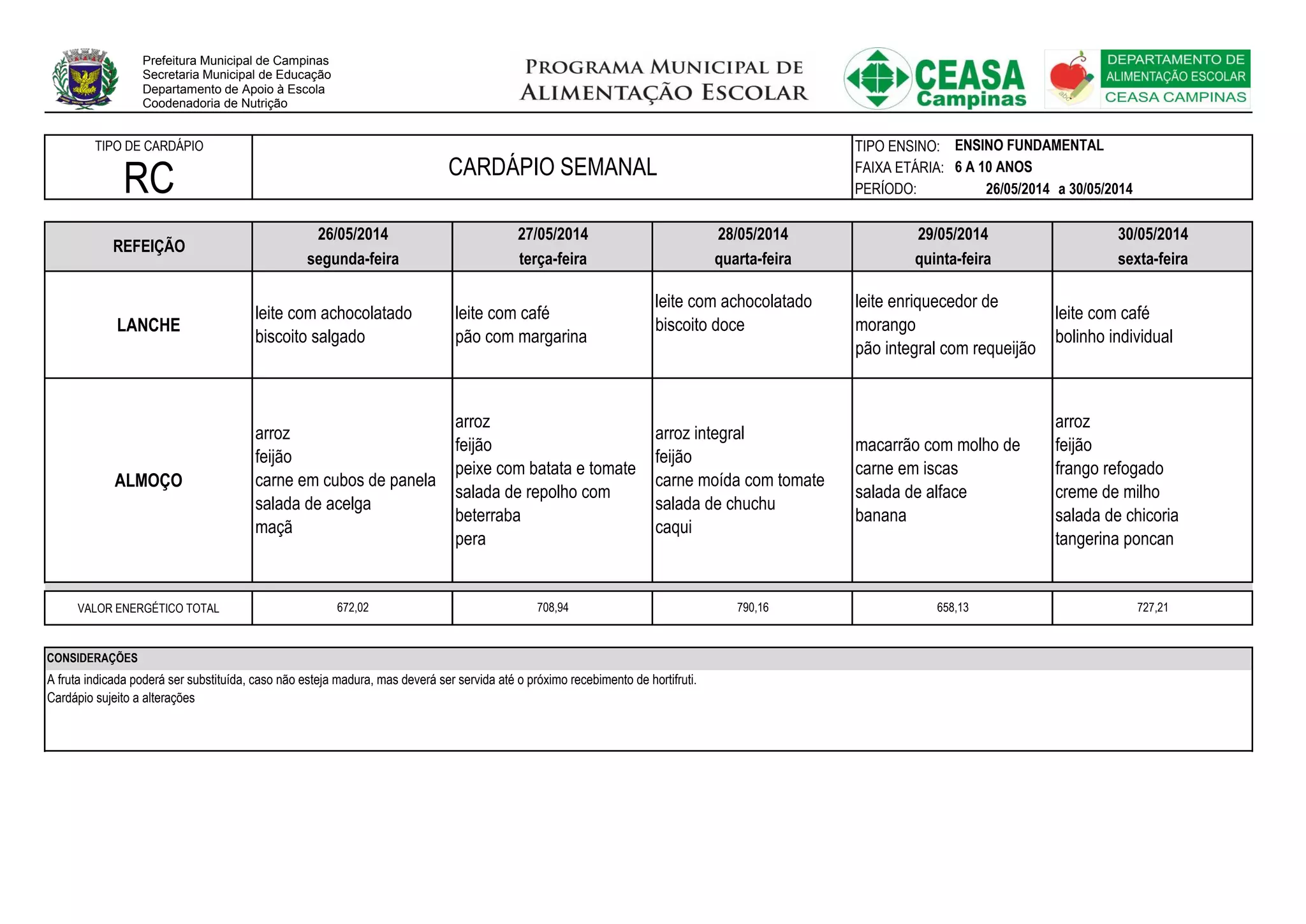 O documento apresenta o cardápio semanal de lanche e almoço para estudantes de 6 a 10 anos de uma escola fundamental em Campinas, com as refeições e valores energéticos totais de 26 a 30 de maio de 2014.