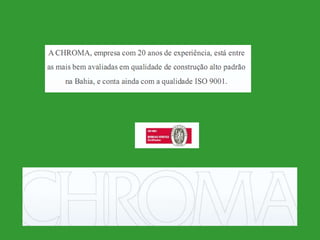 O documento apresenta um novo empreendimento de alto padrão chamado Chroma, localizado na praia de Patamares, Salvador, oferecendo 92 apartamentos com vista para o mar. Cada unidade possui opções de 1 e 2 quartos e conta com diversas comodidades, como piscina, spa, sala de estudos e área de lazer. A entrega está prevista para dezembro de 2012 e informações adicionais podem ser obtidas através de contato direto com o corretor.