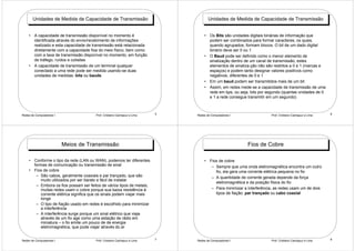 Este documento discute a transmissão de dados em redes de computadores. Ele aborda três pontos principais: 1) a definição de transmissão de dados e seus elementos básicos como fonte, informação, veículo de transmissão e receptor; 2) as diferentes tecnologias de transmissão como fios de cobre, fibras óticas, rádio e satélites; 3) a diferença entre informação analógica e digital e as tecnologias analógicas e digitais de transmissão.