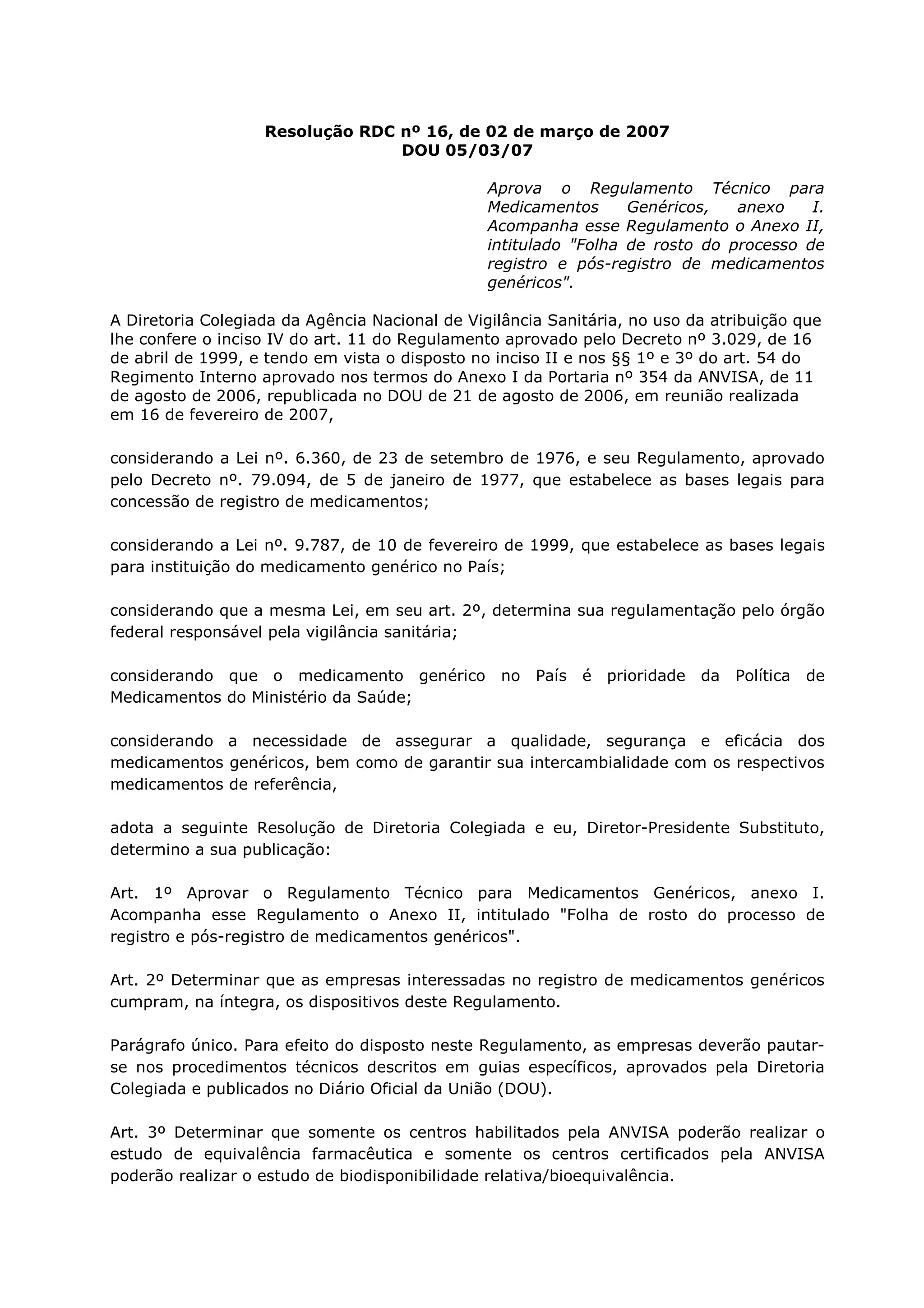 O documento aprova o Regulamento Técnico para Medicamentos Genéricos no Brasil, que estabelece preceitos e procedimentos para o registro de medicamentos genéricos, incluindo definições, medidas antecedentes ao registro, documentação necessária e critérios pós-registro.