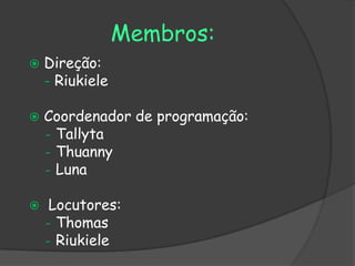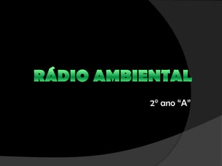 O documento descreve os membros e projetos de uma rádio ambiental em uma escola. A rádio tem como objetivo informar e conscientizar sobre meio ambiente e divulgar projetos da escola. Os projetos incluem coleta seletiva, desmatamento, tipos de poluição, horta escolar, jornal e pomar.