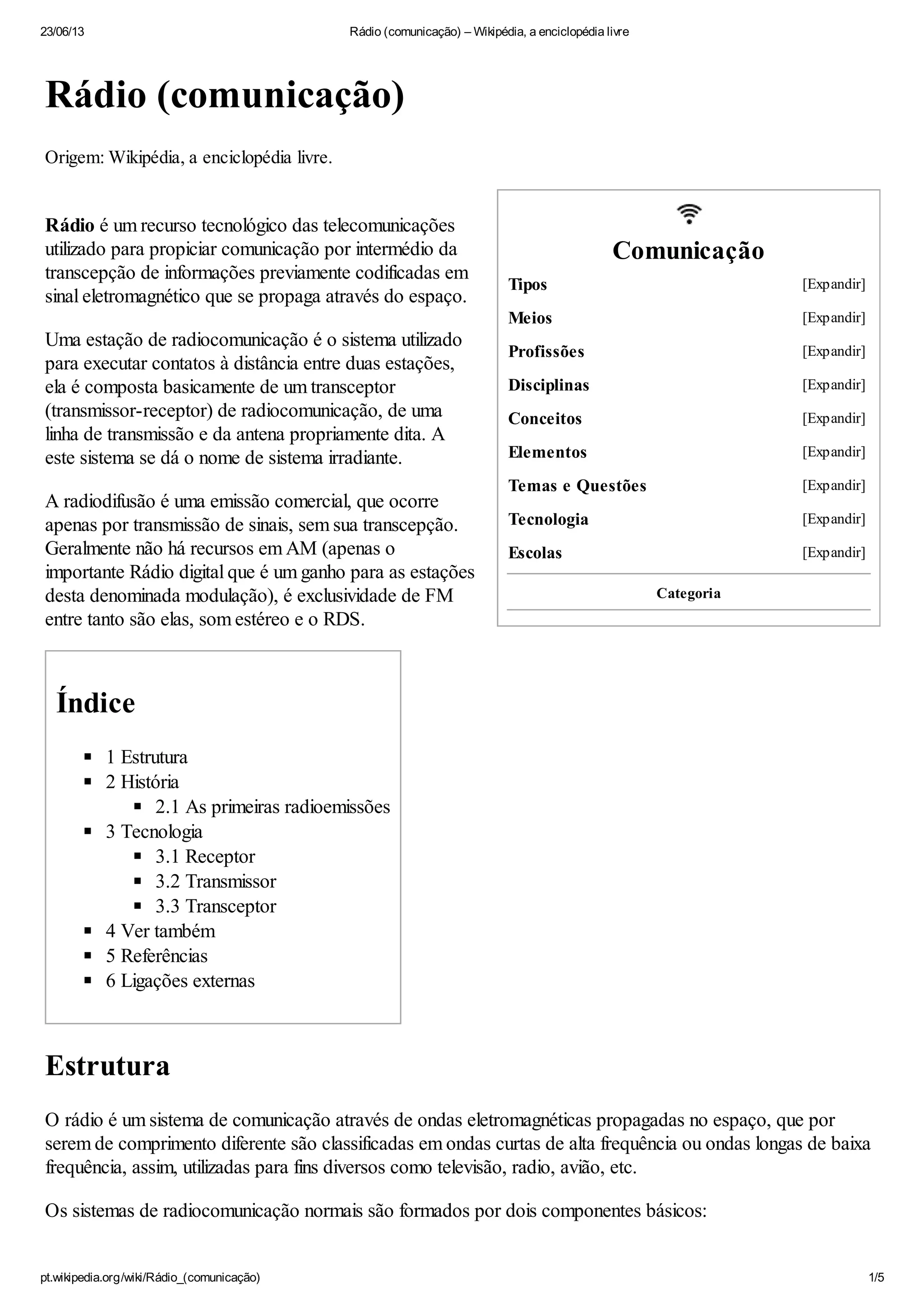 O documento descreve a história e tecnologia da comunicação por rádio. Ele explica que o rádio usa ondas eletromagnéticas para transmitir informações entre estações através do espaço. Também discute os principais componentes de transmissores e receptores de rádio e os pioneiros da tecnologia de rádio como Marconi e Tesla.