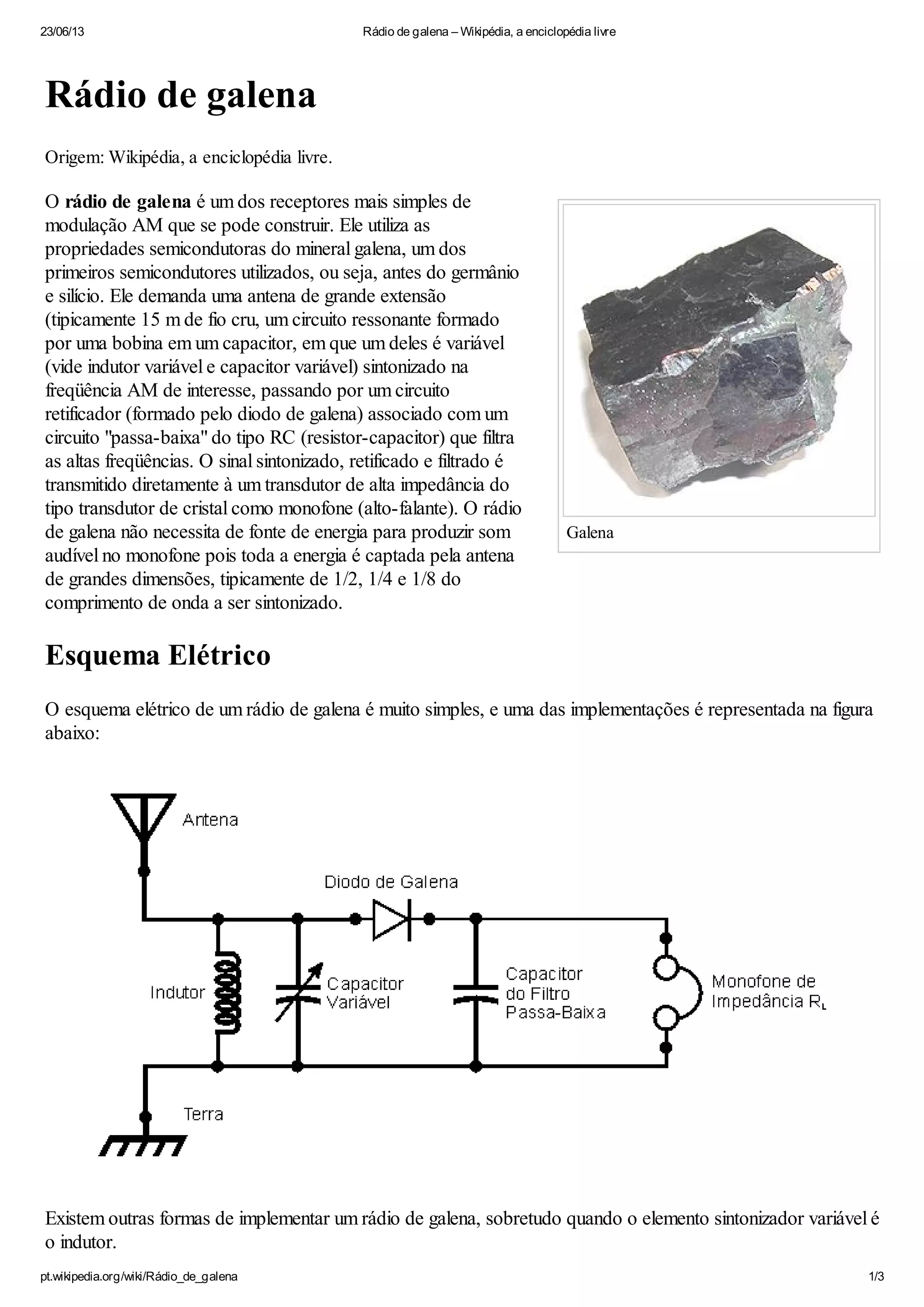 O documento descreve o rádio de galena, um dos receptores de rádio mais simples. Ele utiliza o mineral galena como um semicondutor primitivo para retificar o sinal de rádio AM captado por uma grande antena. O sinal retificado é então filtrado para remover frequências altas antes de ser transmitido para um alto-falante. O documento fornece esquemas elétricos e de blocos mostrando como o rádio de galena funciona para receber sinais de rádio sem necessidade de energia.