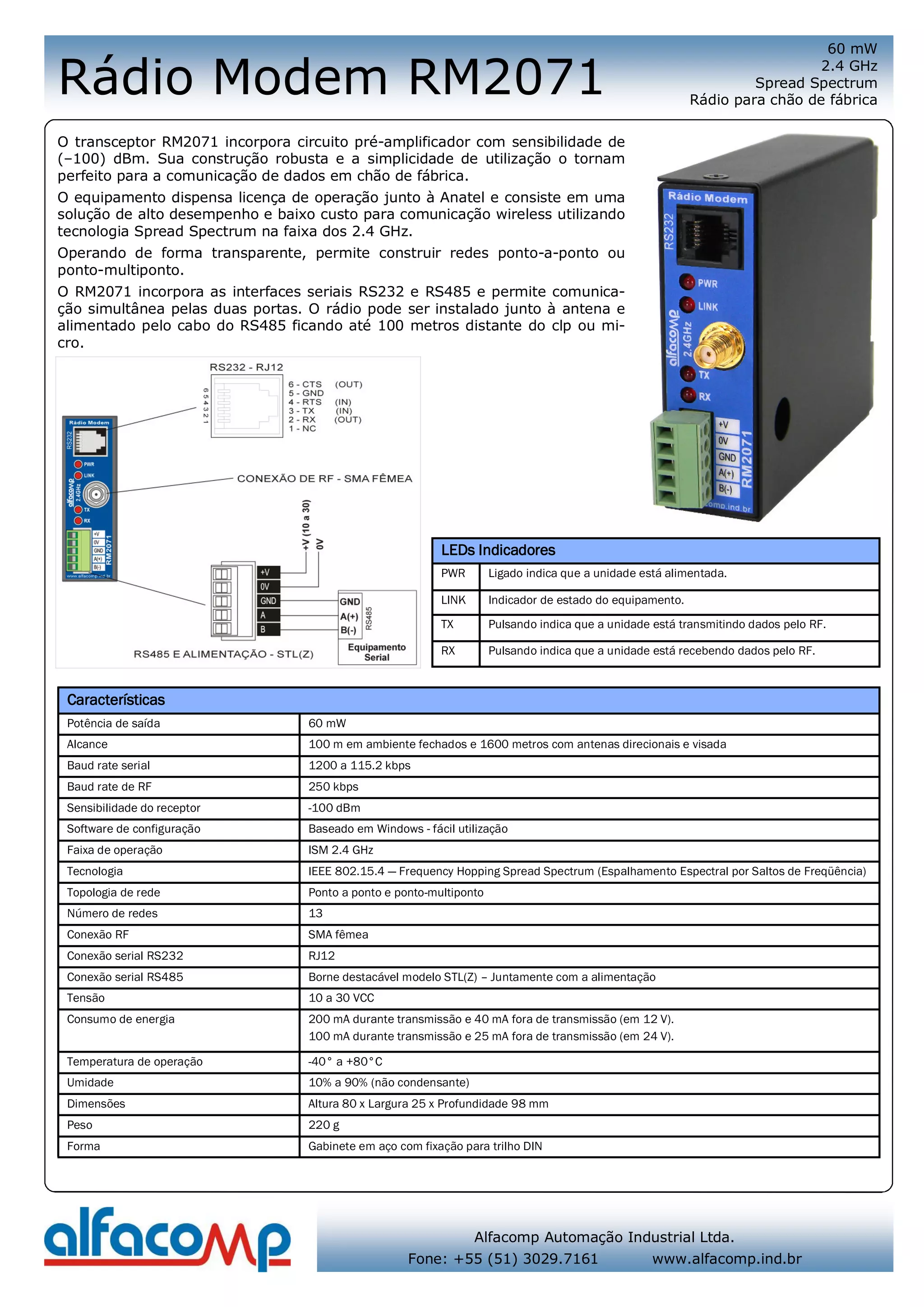 O RM2071 é um rádio modem de 2.4 GHz com alcance de até 1600 metros que permite comunicação sem fio ponto-a-ponto ou ponto-multiponto em fábricas. Possui interfaces RS-232 e RS-485, potência de saída de 60 mW, e é projetado para operar em ambientes industriais com temperaturas de -40°C a 80°C.
