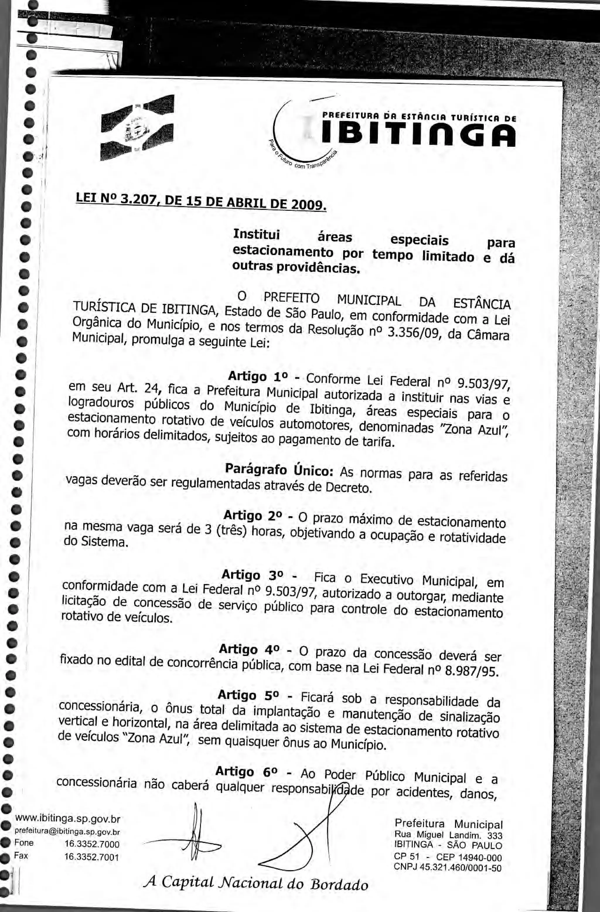 A lei institui áreas especiais para estacionamento rotativo ("Zona Azul") em Ibitinga, limitando o tempo de estacionamento a 3 horas. Autoriza a prefeitura a conceder o serviço mediante licitação e define que a implantação e manutenção da sinalização será de responsabilidade da concessionária.
