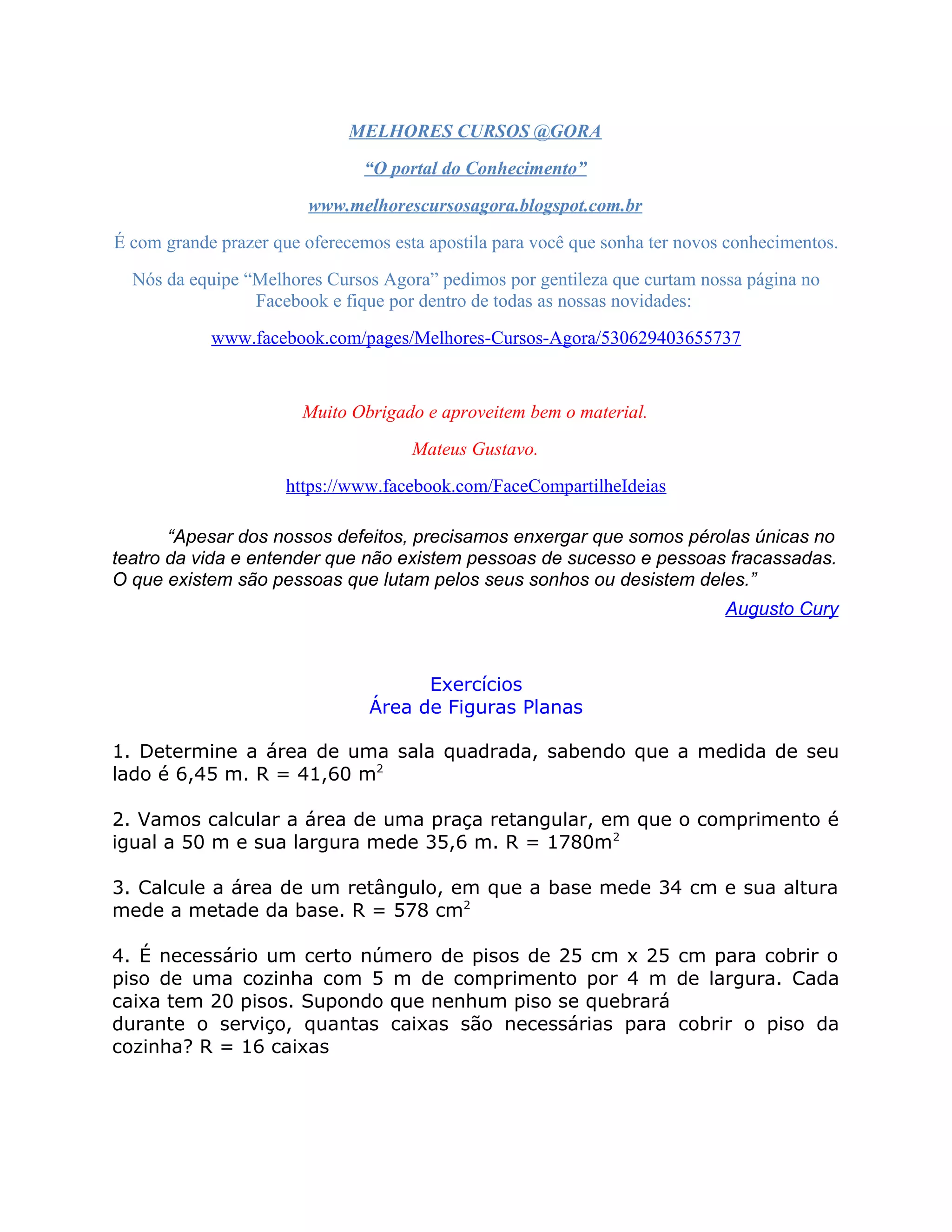 Este documento apresenta um resumo sobre cursos online e convida os leitores a acompanhar a página no Facebook "Melhores Cursos Agora" para ficarem por dentro das novidades sobre cursos. Também fornece exercícios de área de figuras planas para praticar cálculos matemáticos.