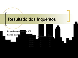 (1) O documento apresenta os resultados de um inquérito realizado com 437 residentes de Vila Praia de Âncora sobre vários aspectos da vila, incluindo história, monumentos, gastronomia, associações e opiniões sobre o trânsito e estacionamento; (2) Os inquiridos foram divididos em grupos por faixa etária e sexo, variando entre 15-19 anos e 65-79 anos; (3) Foram feitas várias perguntas a cada grupo sobre a sua ligação à vila e avaliação de diferentes itens relacionados ao funcionamento