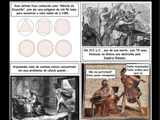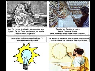 O documento discute os componentes e conceitos fundamentais do círculo, incluindo circunferência, raio, diâmetro, perímetro e área. Exemplos mostram como calcular o perímetro percorrido em voltas em torno de um círculo e a área de regiões circulares.